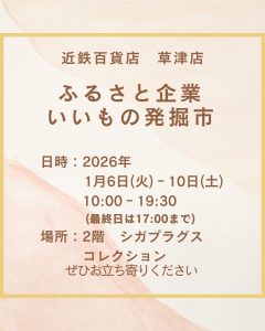 ・1月6日(火)~1月10日(土)、近鉄百貨店草津店2Fにて「草津ふるさと企業いいもの発掘市」に催事出店いたします
